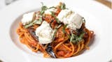 Spaghetti, eggplant, spicy marinara sauce, burrata, fresh basil.Vegetarian.