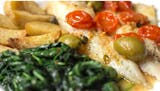 Wild caught north Atlantic cod, pan seared in a lemon caper sauce and crushed cherry tomatoes served with sauteed spinach and roasted potatoes. Gluten free.